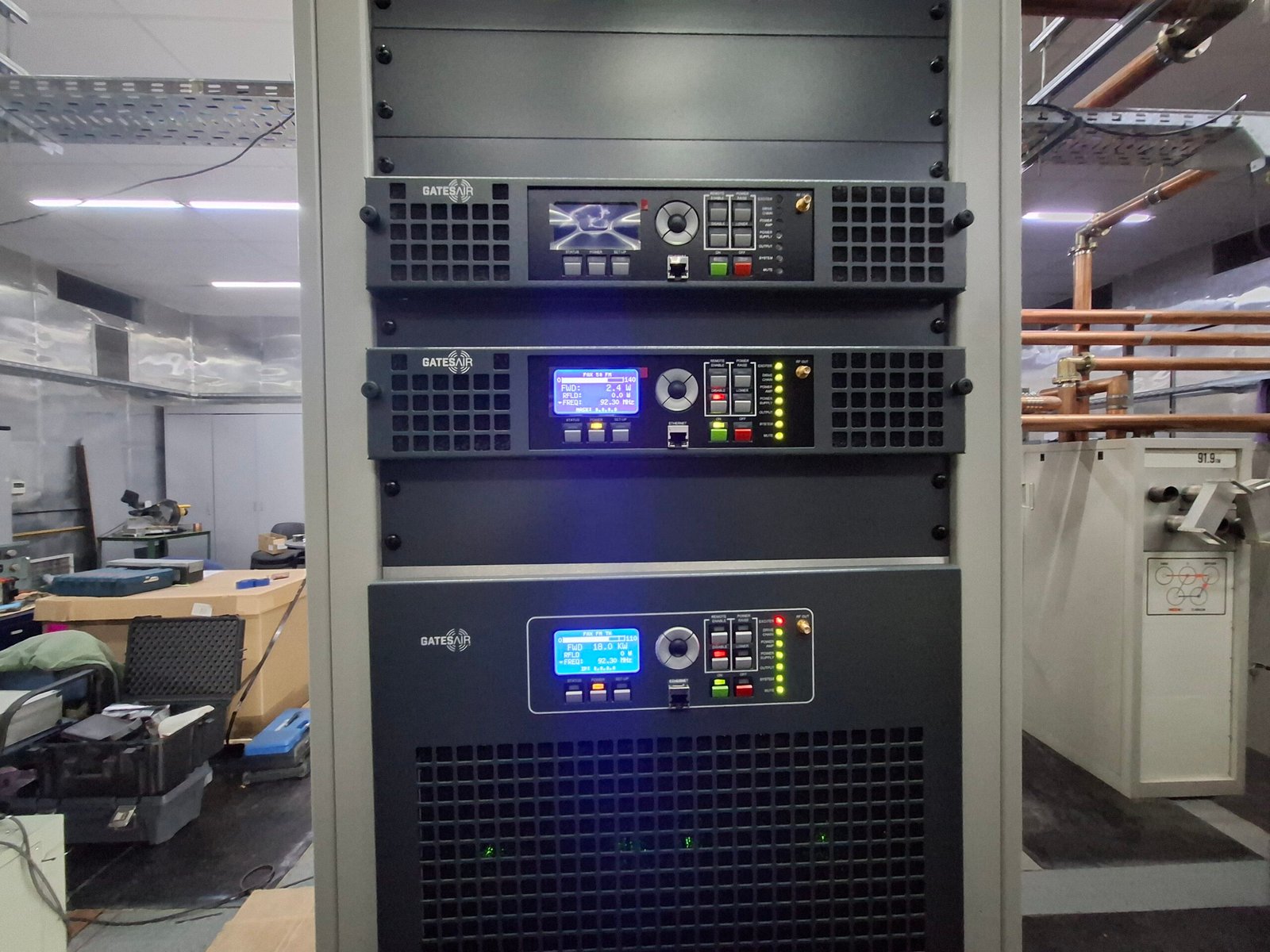 Excitador superior en Stand By, segundo excitador al aire, mas abajo controlador de etapa de potencia.